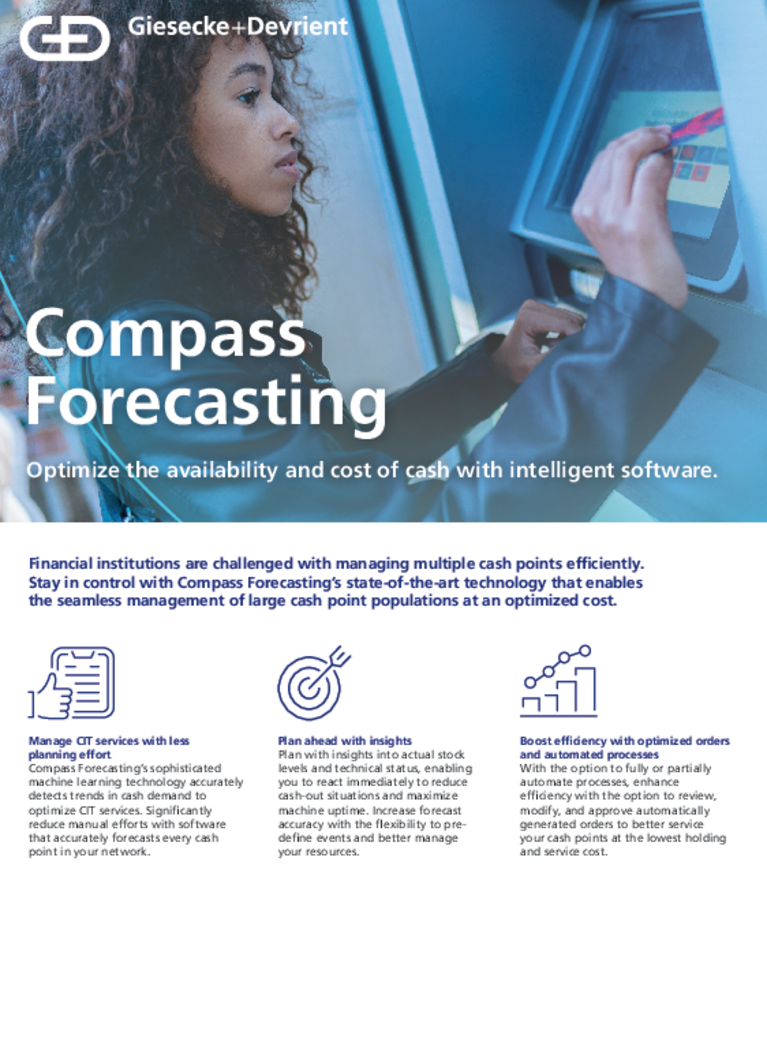 Cash flows constantly in a dynamic cycle, and Compass Forecasting’s data-driven technology accurately controls the flow and cost of cash for CITs and supply chain partners. Technology that intelligently simplifies inbound and outbound cash processes enables CITs to optimize services and maintain a strategic balance of cash inventory for their customers. This all-in-one solution provides real-time insight into replenishment and maintenance orders, technical status, and cash levels of machines and cash points for full visibility and enhanced security. Optimize the availability of cash inventory with the agility to react immediately to a changing world.