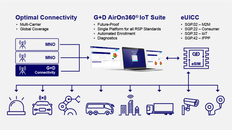 - Integrated with G+D’s AirOn360® platform for unified connectivity lifecycle control