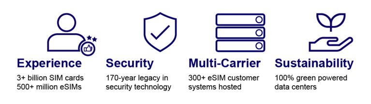 With 30+ years of expertise in SIM technology and connectivity, G+D combines industry leadership with proven reliability. We deliver secure, globally scalable IoT connectivity and support enterprises end-to-end – backed by sustainable operations and continuous innovation.