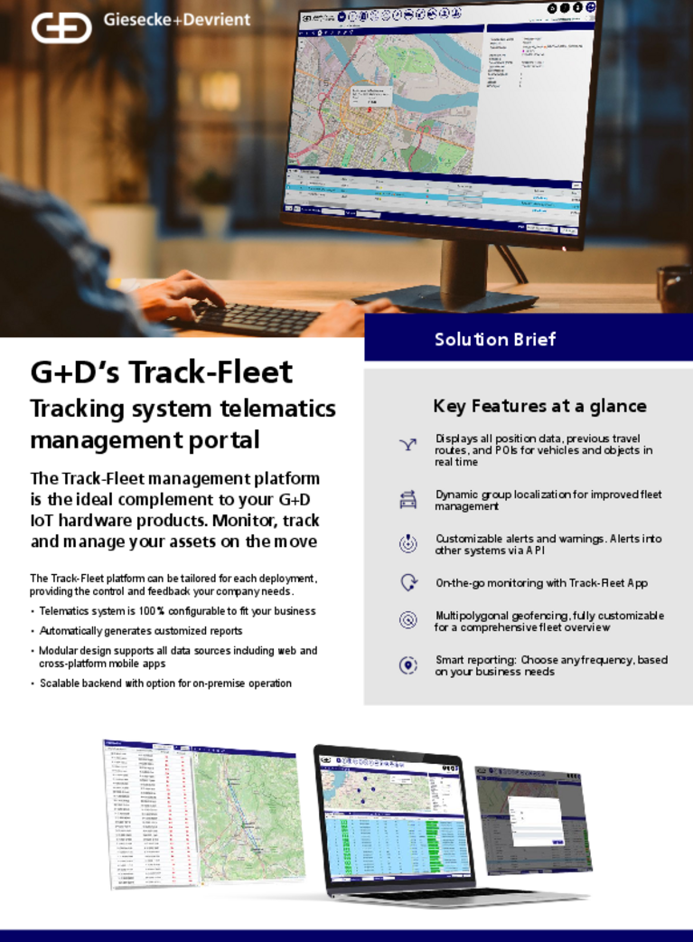 The Track-Fleet platform is a unified digital dashboard that seamlessly interconnects TMS, fleet management, CRM, ERP, and all your other systems to maximize the full potential of your software landscape. Thanks to its robust API, data can be simply and seamlessly delivered to any other application, while its full-featured internal capabilities and rich visual interface enable powerful insight and Business Intelligence possibilities. It’s fully scalable and up to the challenge of any wide-ranging logistics program, no matter how complex. The ideal accompaniment to G+D’s IoT tracking hardware solutions, rely on Track-Fleet for:
